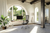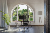 comfortable workplace with pc standing on wooden desk in office at home; bright sunlight shines from side through window; wall with canvas copy space; remote work freelance concept; 3D Illustration