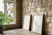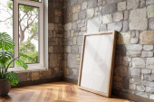 comfortable workplace with pc standing on wooden desk in office at home; bright sunlight shines from side through window; wall; with canvas copy space; remote work freelance concept; 3D Illustration
