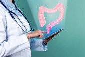 Objawy i leczenie zgagi i innych chorób przewodu pokarmowego. Lekarz trzymający ilustrację żołądka na czarnym tle, zbliżenie