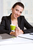 Dziewczyna siedzi przy stole picia kawy ze szklanki