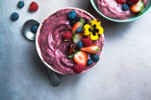 Zdjęcie "Dwie letnie akai miski smoothie z truskawkami, jagodami, na szarym tle betonu. Miska śniadaniowa z owocami i zbożem, zbliżenie, widok z góry, zdrowa żywność" może być wykorzystywane do celów osobistych i komercyjnych zgodnie z warunkami zakupionej licencji Royalty-free. Obraz jest dostępny do pobrania w jakości wysokiej rozdzielczości do 5760x3840.