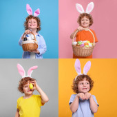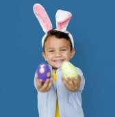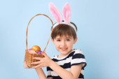 Happy boy in bunny ears headband holding wiklinowy kosz z malowanymi pisankami na turkusowym tle