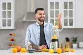 Zdjęcie "Przystojniak z pysznym smoothie przy białym marmurowym stole w kuchni. Miejsce na tekst" może być wykorzystywane do celów osobistych i komercyjnych zgodnie z warunkami zakupionej licencji Royalty-free. Obraz jest dostępny do pobrania w jakości wysokiej rozdzielczości do 5760x3840.