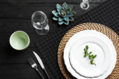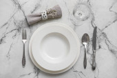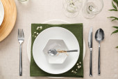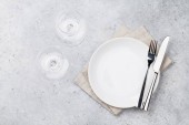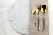 Stylowe ustawienie z sztućcami i liści eukaliptusa na jasnoszarym stole, płaska leżanka. Miejsce na tekst