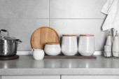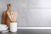 Naczynia kuchenne i inne naczynia kuchenne na szarym blat w kuchni, miejsce na tekst. Projekt banera