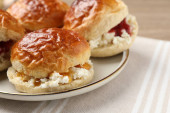 Zdjęcie "Świeżo upieczone babeczki z wodą sodową z dżemem żurawinowym, masłem i filiżanką herbaty na jasnoszarej macie, zbliżenie" może być wykorzystywane do celów osobistych i komercyjnych zgodnie z warunkami zakupionej licencji Royalty-free. Obraz jest dostępny do pobrania w jakości wysokiej rozdzielczości do 5760x3840.