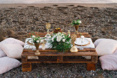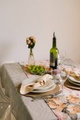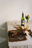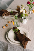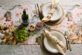 Vintage table setting with Linen napkins and floral decorations. Close up. Cozy calm meal in the morning in the sunshine.