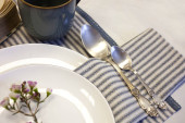 Zdjęcie "Vintage table setting with Linen napkins and yellow lemons. Decoration table. Close up. Cozy calm meal in the morning in the sunshine." może być wykorzystywane do celów osobistych i komercyjnych zgodnie z warunkami zakupionej licencji Royalty-free. Obraz jest dostępny do pobrania w jakości wysokiej rozdzielczości do 5760x3840.