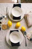 Vintage table setting with Linen napkins and yellow lemons. Decoration table. Close up. Cozy calm meal in the morning in the sunshine.