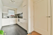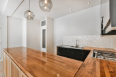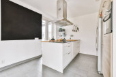 Zdjęcie "nowoczesna kuchnia z białymi szafkami i czarnymi blatami na wyspie przed zlewem wykonana jest z betonu" może być wykorzystywane do celów osobistych i komercyjnych zgodnie z warunkami zakupionej licencji Royalty-free. Obraz jest dostępny do pobrania w jakości wysokiej rozdzielczości do 5760x3840.