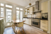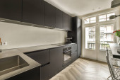 Zdjęcie "kuchnia z drewnianą podłogą i białe szafki w centrum obrazu jest otwarte okno, które wychodzi na ulicę" może być wykorzystywane do celów osobistych i komercyjnych zgodnie z warunkami zakupionej licencji Royalty-free. Obraz jest dostępny do pobrania w jakości wysokiej rozdzielczości do 5760x3840.