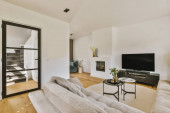 Zdjęcie "pokój dzienny z kanapą, stołem kawowym i telewizorem na ścianie w pokoju jest ciemnoniebieski" może być wykorzystywane do celów osobistych i komercyjnych zgodnie z warunkami zakupionej licencji Royalty-free. Obraz jest dostępny do pobrania w jakości wysokiej rozdzielczości do 5760x3840.