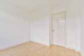 pusty pokój z białymi ścianami i drewnianą podłogą na ścianie, jest małe okno w rogu