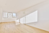 Zdjęcie "pusty pokój z białymi ścianami i drewnianą podłogą, są przesuwane szklane drzwi prowadzące na patio" może być wykorzystywane do celów osobistych i komercyjnych zgodnie z warunkami zakupionej licencji Royalty-free. Obraz jest dostępny do pobrania w jakości wysokiej rozdzielczości do 5760x3840.