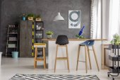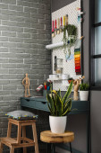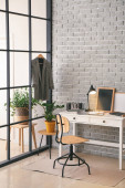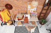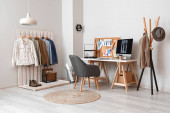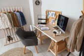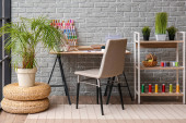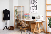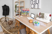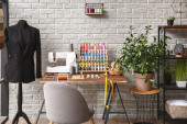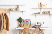 Wnętrze atelier z miejscem pracy krawca, szpule nici i manekina
