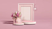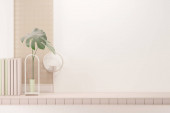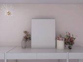 Zdjęcie "3D renderować puste białe sztuki ramki na beżowej tapecie z eleganckim białym drewnianym kredensie z modnymi liśćmi kwiatów w wazonach, dmuchanie białych firanek, poranne światło słoneczne. Strona główna, Cytaty, Plakat." może być wykorzystywane do celów osobistych i komercyjnych zgodnie z warunkami zakupionej licencji Royalty-free. Obraz jest dostępny do pobrania w jakości wysokiej rozdzielczości do 5760x3840.