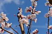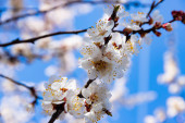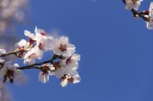 piękne białe kwiaty, kwiat jabłoni na błękitnym tle nieba