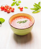 Zupa pomidorowa w szklanym garnku na ciemnym stole kuchennym ze składnikami. Odbiór. Zdrowe jedzenie. Wegetariańskie jedzenie