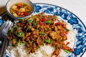 Stir fried Thai basil with minced pork and a fried egg on white plate