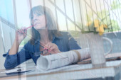 Dojrzałe businesswoman mówi na słuchawkach i za pomocą laptopa; efekt świetlny