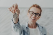 Ręka afrykańskiej lub europejskiej dziewczyny trzyma klucz z nowego domu. Nastolatka lub młoda kobieta wynajmuje mieszkanie. Inwestycje i sukces. Kredyty hipoteczne i zakup nieruchomości, nieruchomości.