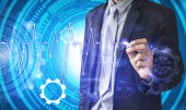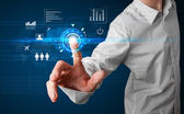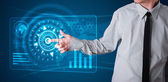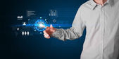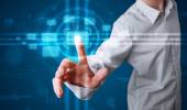 przystojny biznesmen dotykając web przyszłych technologii przyciski i