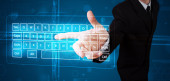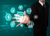 Biznesmen wciskający nowoczesne przyciski typu high tech