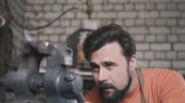 Mechanik naprawia podwozie samochodu. Mężczyzna naprawia samochód w garażu. Naprawa kół samochodu