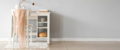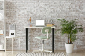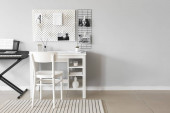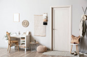 Wnętrze stylowego pokoju z nowoczesnym miejscem pracy i regałami. Baner do projektowania