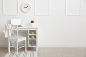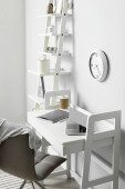 Zdjęcie "Wnętrze stylowego pokoju z nowoczesnym miejscem pracy i regałami. Baner do projektowania" może być wykorzystywane do celów osobistych i komercyjnych zgodnie z warunkami zakupionej licencji Royalty-free. Obraz jest dostępny do pobrania w jakości wysokiej rozdzielczości do 5760x3840.