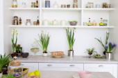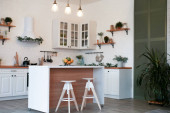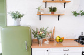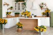 Zdjęcie "Bukiet tulipanów na drewnianym stole. W tle wnętrze białej kuchni w stylu skandynawskim. Koncepcja komfortu w domu" może być wykorzystywane do celów osobistych i komercyjnych zgodnie z warunkami zakupionej licencji Royalty-free. Obraz jest dostępny do pobrania w jakości wysokiej rozdzielczości do 5760x3840.