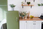 Zdjęcie "Bukiet tulipanów na drewnianym stole. W tle wnętrze białej kuchni w stylu skandynawskim. Koncepcja komfortu w domu" może być wykorzystywane do celów osobistych i komercyjnych zgodnie z warunkami zakupionej licencji Royalty-free. Obraz jest dostępny do pobrania w jakości wysokiej rozdzielczości do 5760x3840.