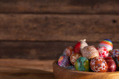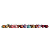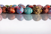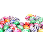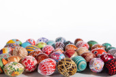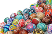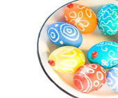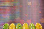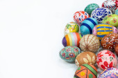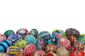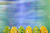 Kompozycja Wielkanocna składa się z kolorowych pisanek z białym miejscem do wypełnienia, jak chcesz.