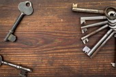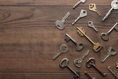 Różne stare klucze na drewnianym tle widok z góry. Stare klucze o różnych kształtach na vintage surfac