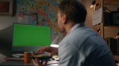 Przyjemny człowiek, cieszący się muzyką w domu. Pozytywny wolny strzelec słuchający nowoczesnych utworów, wpisujący tylko makietę. Szczęśliwy facet porusza się rytmicznie na krześle zdalne miejsce pracy wieczorem mieszkanie