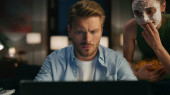 Przemyślany filmik z wolnym strzelcem na czacie, zdalnie zbliżenie. Spokojny facet oglądający laptopa w przytulnym, wieczornym miejscu pracy. Sylwetka żony tańczącej tło. Overwork człowiek omawiając przygotowanie niezbędne zadanie