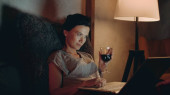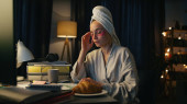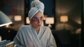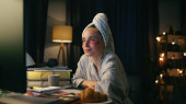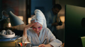 Zajęty robotnikiem, piszący notatki w nocy. Zmęczona dziewczyna czuje dyskomfort w domu. Mąż sylwetka odkurzanie odległość kołysania. Nadgodziny kobieta próbuje koncentracji, podczas gdy mężczyzna przeszkadza niepokojące