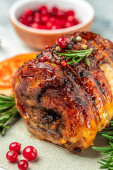 Roll of meat with various spices and berry sauce on a dark background. banner, menu, recipe place for text, top view.