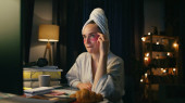 Skupiony księgowy esemesuje domowy zoom. Poważna kobieta licząca się z budżetem. Freelance girl przygotowuje cotygodniowy raport wpisując klawiaturę wieczorem zdalnie. Człowiek sylwetka śpiew suszarka