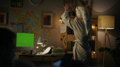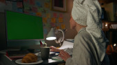 Skupiona kobieta przeglądająca smartfona w nocy zbliżenie mieszkania. Poważna kobieta wysyłająca wiadomości komórkowe przy stole po prysznicu. Zajęta dziewczyna siedzi na zielonym ekranie zdalne miejsce pracy sam widok z tyłu