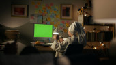 Zdjęcie "Podekscytowany mężczyzna tak gestykulujący zbliżenie domu. Tylne widoku freelancer wpisując makieta komputer pracuje zdalnie. Cieszył się, oglądając zwycięski projekt z zielonym ekranem. Kobieta sylwetka siedzi sofa na pierwszym planie" może być wykorzystywane do celów osobistych i komercyjnych zgodnie z warunkami zakupionej licencji Royalty-free. Obraz jest dostępny do pobrania w jakości wysokiej rozdzielczości do 5760x3840.