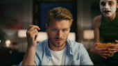 Nerwowy człowiek wkurzył komputer w ciemnym pokoju. Wściekły facet czuje dyskomfort. Bezrobotna żona sylwetka tańczy niepokojąco w tle. Nadgodziny wolny strzelec robi wymówki na czacie wideo