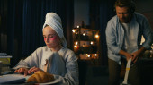 Smutna pani mówiąca smartfonem w domu zbliżenie. Beztroski mężczyzna odkurza żonę od pracy. Zestresowana kobieta rozmawiająca przez telefon w mieszkaniu. Koncepcja niedogodności związanych z pracą zdalną