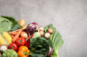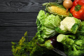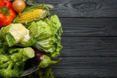 Różne świeże warzywa w wiklinowym koszu na czarnym drewnianym stole, widok z góry z miejsca na tekst. Zbiory dla rolników