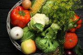 Zdjęcie "Różne świeże warzywa w wiklinowym koszu na czarnym drewnianym stole, widok z góry z miejsca na tekst. Zbiory dla rolników" może być wykorzystywane do celów osobistych i komercyjnych zgodnie z warunkami zakupionej licencji Royalty-free. Obraz jest dostępny do pobrania w jakości wysokiej rozdzielczości do 5760x3840.