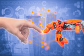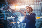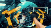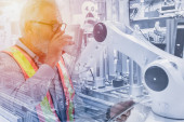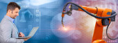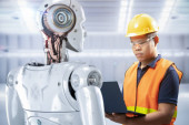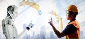 Zdjęcie "Inżynier pracownik z robotem Sztuczna inteligencja z AI Technologia dla automatyki Fabryka Przemysł Dołącz razem szeroki baner" może być wykorzystywane do celów osobistych i komercyjnych zgodnie z warunkami zakupionej licencji Royalty-free. Obraz jest dostępny do pobrania w jakości wysokiej rozdzielczości do 5760x3840.