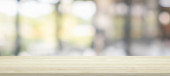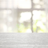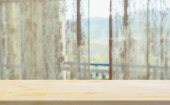 Pusty blat drewniany z zasłoną okienną abstrakcyjne rozmycie tła do wyświetlania produktu