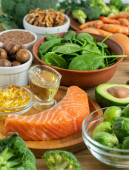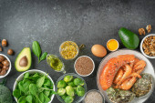 Zdrowe posiłki na białym drewnianym tle. Widok z góry, płaski.
