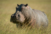 Zdjęcie "Cielę hipopotama stoi na wyspie w rzece" może być wykorzystywane do celów osobistych i komercyjnych zgodnie z warunkami zakupionej licencji Royalty-free. Obraz jest dostępny do pobrania w jakości wysokiej rozdzielczości do 5760x3840.