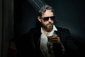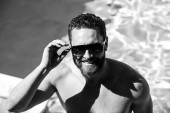 Miejski facet w stylu casual ubrania chodzić w mieście Tampa. Portret atrakcyjnego mężczyzny w luźnych ciuchach spaceruje po amerykańskim mieście. Przystojny młodzieniec w miejskim stylu życia spacerujący ulicą